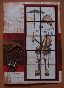 I used one of my new Tatty Button stamps, she is just the right shape for this thin sized card. One of the layers was an embossed scrap of card, the rosette was made using an EK punch.